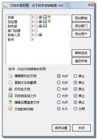 2、文档共享:文档创建者或管理者有权决定不同的文档共享给哪些不同的用户。不同的用户可以有不同的权限:用户是否具有编辑修改的权限,用户是否具有打印拷贝的权限,用户是否具有只读查看的权限,用户是否具有另存文档的权限。