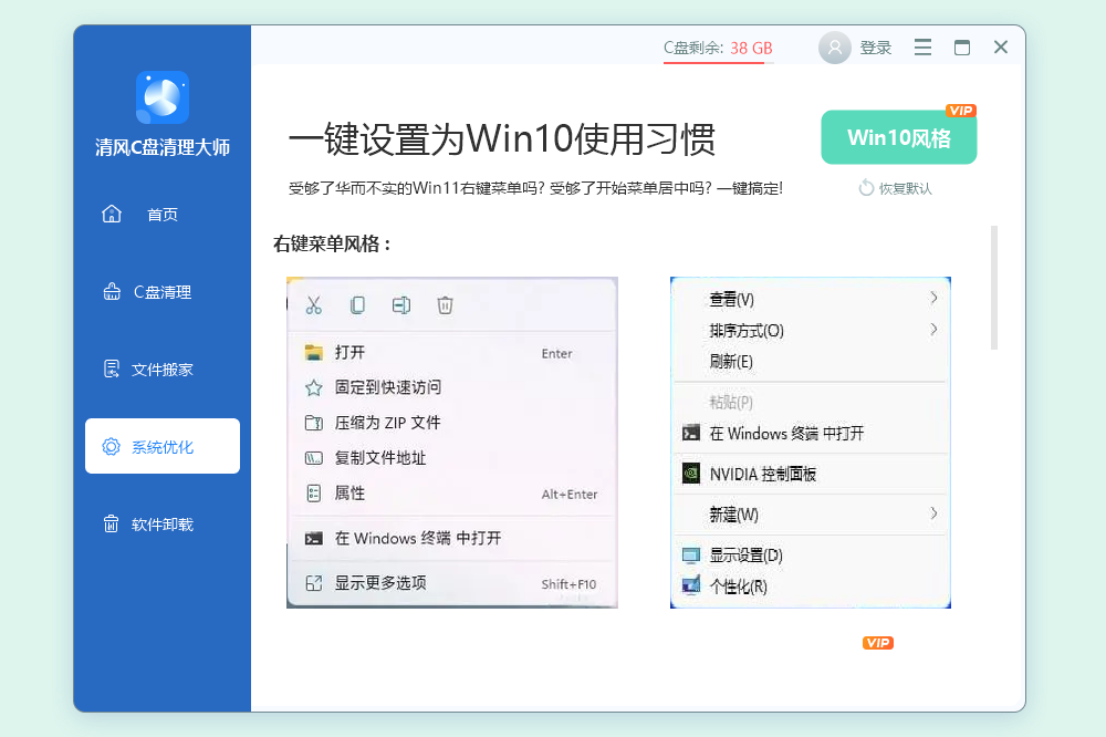 清风C盘清理大师操作简单、精致小巧,帮您轻松清理C盘中的垃圾文件、临时文件和无用的缓存,释放宝贵的存储空间,让您的电脑运行更流畅。