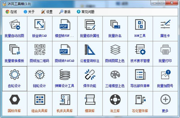 沐风工具箱是沐风网全新升级发布的一款出色的SolidWorks设计方案软件商品,关键包含20好几个大作用,在其中包含链轮设计工具、链轮设计工具 、标准件库、工程图批量变换工具、钣金件变换工具、BOM工具、批量全自动工程图工具、尺寸公差查看标明工具、弹簧设计工具、机床夹头库、组成工装夹具库、法兰盘库、模胚库、石油化工管材库、属性批量修改、任意着色工具等作用;而且中后期会不断升级大量基本功能。