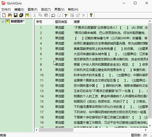 QuickQuiz(题库生成与学习备考软件)是一款复习备赛题库制做训炼软件,可以依据文本文件或word文本文档完成题库生成与编写,现适用单项选择题、选取、分辨、填词语、简单五类题目生成,适用题目大批量生成!