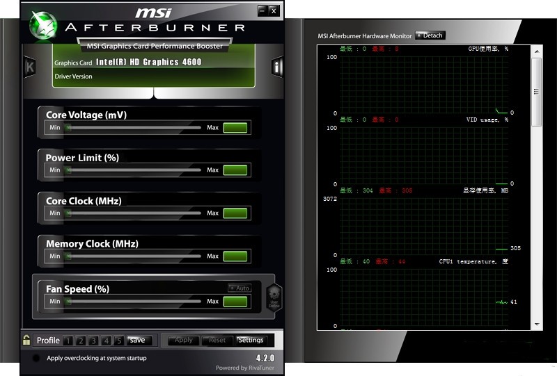 打开该软件的主界面之后,显卡当前工作状态详尽的展现在我们眼前。主界面左侧为控制部分,可以对GPU电压,核心频率,显存频率和风扇转速(需硬件支持)等进行实时调节。而右边部分则是监控部分,可以实时显示核心频率,GPU温度,显存占用率等。
