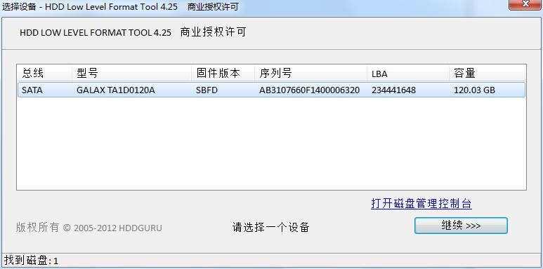 1、打开软件,选择需要低格的硬盘或者U盘,点“继续”进入下一界面;选择"低级格式化",再点格式化;完成后,关闭该软件即完成硬盘的低格操作。