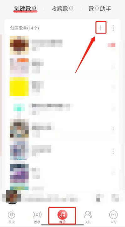 1、首先打开网易云音乐,点击进入我的,找到创建歌单,点击加号。