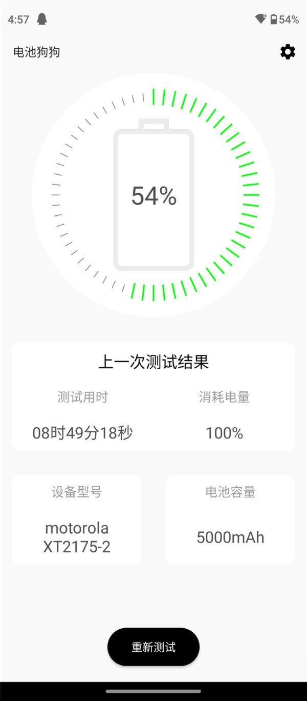 电池狗狗我们勾选极限电量续航测试,手动50%亮度,从100%电量开始测试,用时8小时49分钟后关机。