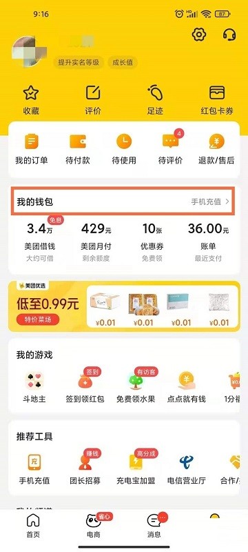 1、首先打开我们的美团app,在右下角进入我的页面,点击【我的钱包】(如图所示)。