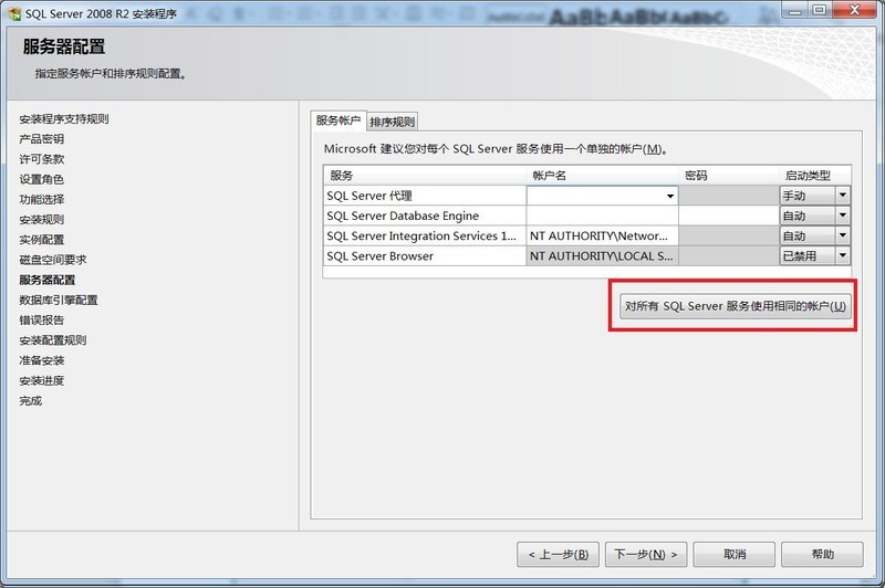 15.选择“对所有SQL Server服务使用相同的账户”,如下图所示。