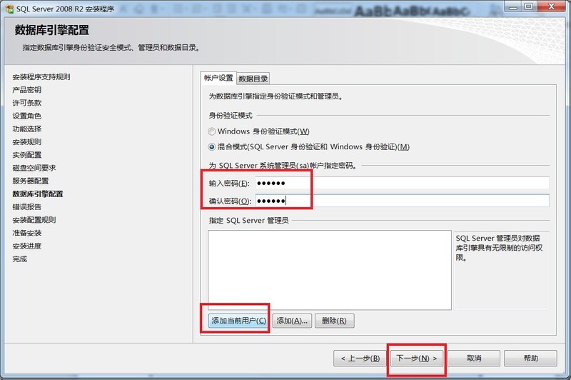 18.在界面中选择账户设置页面,选择身份认证模式为混合模式,设置密码,指定SQL Server管理员中选择“添加当前用户”,然后选择“下一步”,如下图所示。
