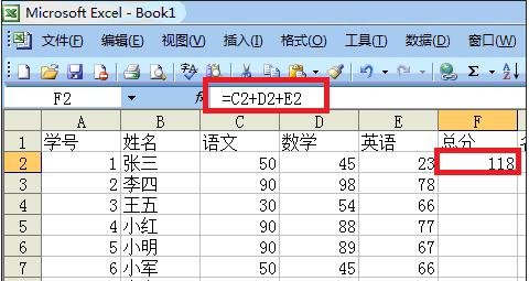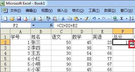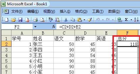 第四步:选中“总分”在fx函数框中输入“=C2+D2+E2”.然后按下回车键。总分出来了(如图所示)。