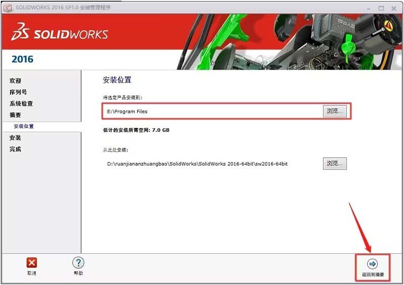 9、点击浏览,选择安装目录文件夹。再点击【返回到摘要】(如图所示)。