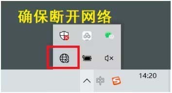 1、首先要退出杀毒软件,并确保断开网络(如图所示)。