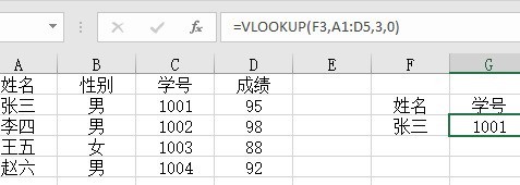 按照精确信息,在数据表中查询对应数据,图中以姓名查学号,使用的是“=VLOOKUP(F3,A1:D5,4,0)”。