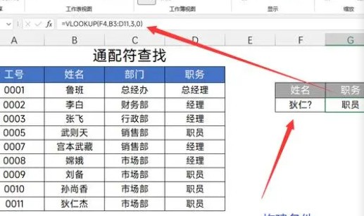 我们可以使用通配符来进行模糊查找,当你在信息记忆模糊时使用,假设不知道名字,就可以使用该方法查询,图中公式为“=VLOOKUP(F4,B3:C11,2,0)”。