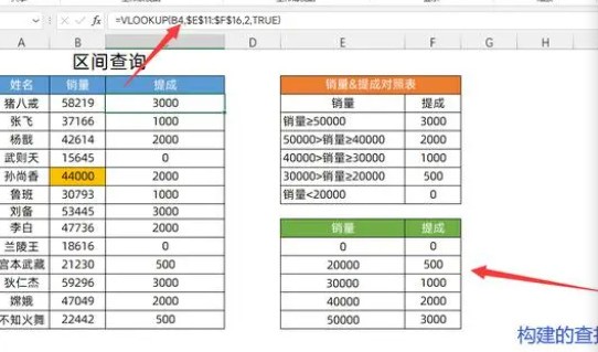 区间查询需要先构建区间,图中绿色标记数据表为区间,此时就可以查询出对应提成了,不过要注意第四参数为1,公式是“=VLOOKUP(B4,$E$11:$F$16,2,TRUE)”。