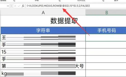 从一堆字符中获取数据,排除非数字内容,识别到有效信息,公式为“=VLOOKUP(0,MID(A3,ROW($1:$102),11)*{0,1},2,FALSE)”。