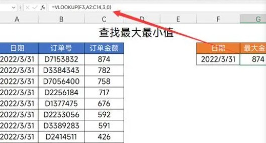 查找某日最大最小销售额时,先使用“排序”工具进行“降序排序”,然后使用公式“=VLOOKUP(F3,A2:C14,3,0)”。