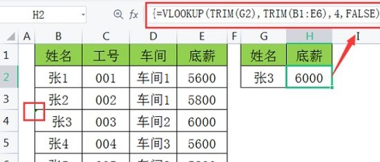 字符串中有空格,返回结果#N/A,该情况需要结合TRIM函数来清空文本中空格,然后再查询数据,在有空格的数据表中查询张3底薪,公式为“=VLOOKUP(TRIM(G2),TRIM(B1:E6),4,FALSE)”。