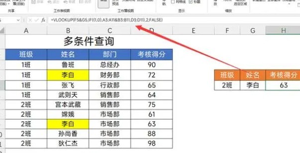 如果表格中存在重复数据时,就要添加上条件来限定查询。图中查找2班李白使用的公式是“=VLOOKUP(F5&G5,IF({1,0},A3:A11&B3:B11,D3:D11),2,FALSE)”。