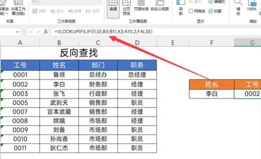 我们想要使用VLOOKUP查询李白工号,就是反向查找,通过已知的姓名去查找左侧的工号,公式是“=VLOOKUP(F5,IF({1,0},B3:B11,A3:A11),2,FALSE)”。