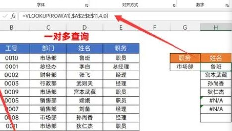 一个信息匹配多个员工,按照部分去查看员工姓名,图中以市场部举例,查询市场部所有员工姓名,公式是“=IFERROR(VLOOKUP(ROW(A1),$A$2:$E$11,4,0),"")”。