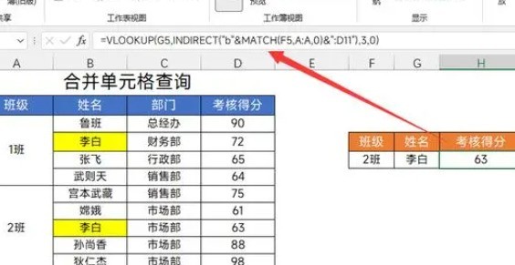 合并不同单元格数据进行查询,需要借助“INDIRECT”函数来跳转,图中为知晓姓名的情况下,将数据统一,查询班级为2班的李白成绩,公式为“=VLOOKUP(G5,INDIRECT("b"&MATCH(F5,A:A,0)&":D11"),3,0)”。