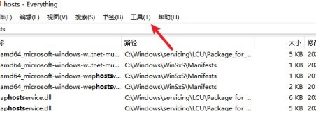 打开everything软件,进入到软件主界面,点击上方箭头所指的工具选项。