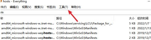 打开everything软件,进入到软件主界面,点击上方箭头所指的工具选项。