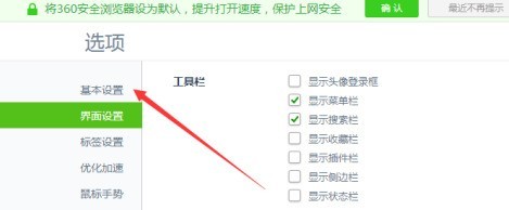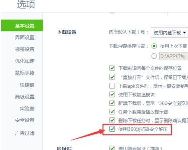 进入到了基本设置界面中,勾选上 使用360浏览器安全解压