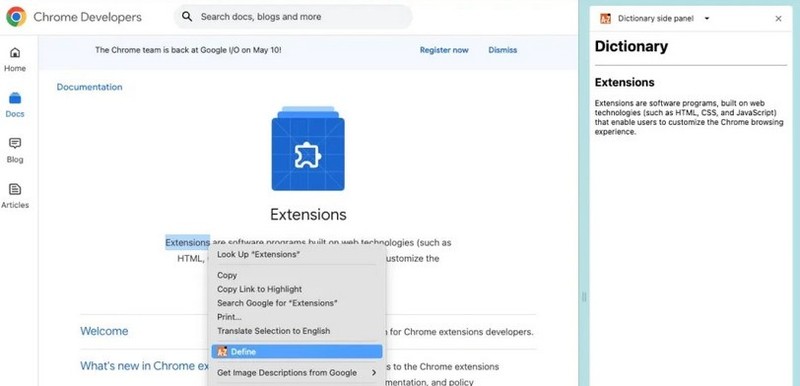 谷歌展示了一款词典应用程序,选中页面中的某个单词之后,扩展程序可以在侧面板显示相应的翻译,ZOL下载在此附上截图如下: