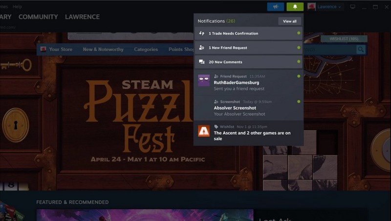 Steam 客户端通知现具备更加丰富和有用的功能。绿色按钮仅在有真正的新信息时才会点亮。托盘视图仅限于新通知,此外还有一个“查看全部”页面,显示历史通知。
