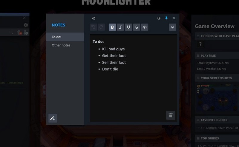 全新的笔记应用让您可以记录下…… 和您正在玩的游戏相关的笔记。这一功能有着富文本格式选项,且每个游戏可记录多个笔记,就算是在离线模式中也可以使用。笔记将按游戏保存,并会同步到您登录的其他 PC 中。除游戏中 Steam 界面外,游戏详情页上也可以看见。