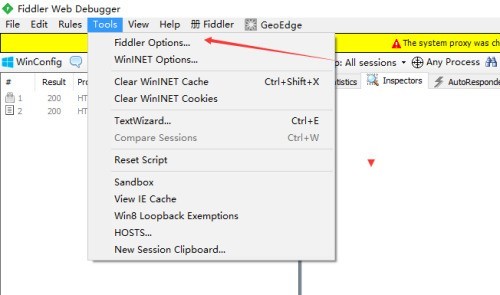 第三步:点击了tools菜单之后,弹出了下拉菜单选中为 fiddler options 选项。