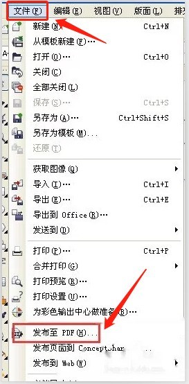 1、 在cdrx4里打开要导出的文件,找到菜单:文件->发布至pdf。