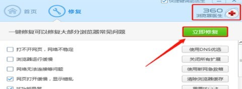 在弹出的【360浏览器医生】窗口中点击【立即修复】。