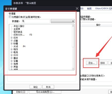 第三步:在“热键”中点击下图位置的“添加”按钮就可以看到完美解码已经设置的默认快捷键了。