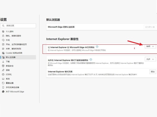 2、然后在默认浏览器页面,找到【Internet explorer兼容性】,选择始终即可。