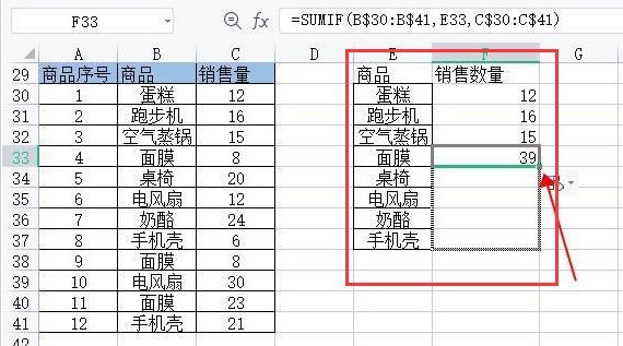 第三步,点击销售数量列单元格输入公式=SUMIF(B$30:B$41,E30,C$30:C$41)