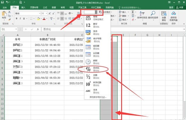 2.随后,鼠标框选需要编辑的单元格行列,点击开始菜单中的格式选项,将其设置为百分比