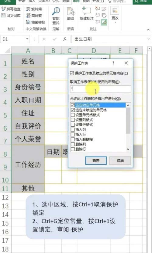 3、在审阅中点击保护工作表,输入密码,点击确定,再输入一次密码,点击确定,即可完成。