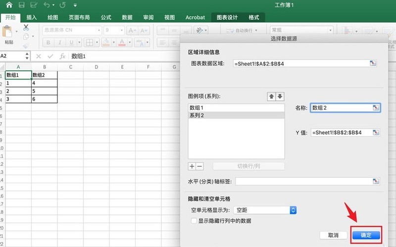 2.在选择数据源弹窗中,依次将图例项列表中的系列1、2文字名称修改为数组1、2