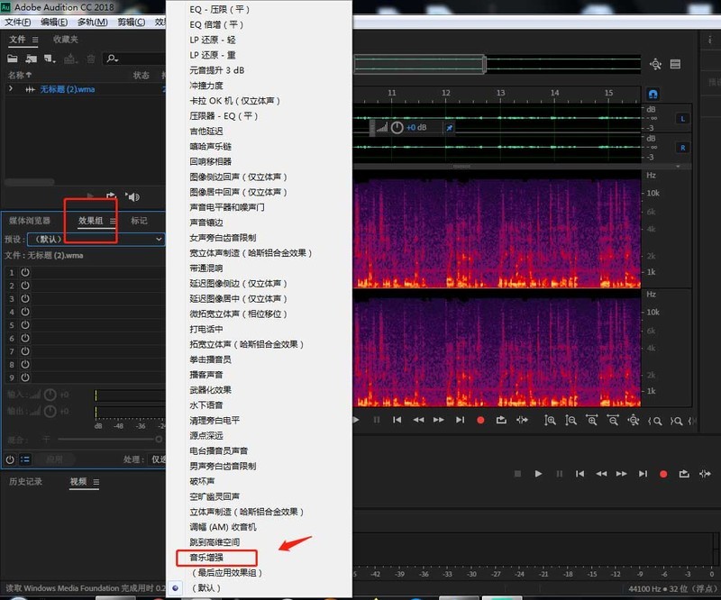4、点击左侧的效果组窗口,在弹出的窗口中,将预设设置为“音乐增强”。
