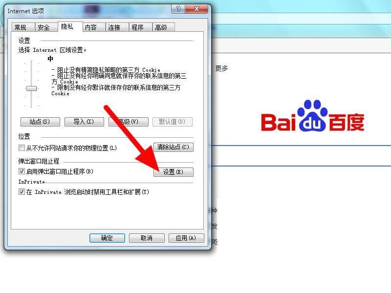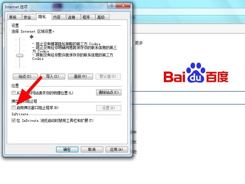 勾选,在隐私项下,勾选 启用弹出窗口阻止程序。