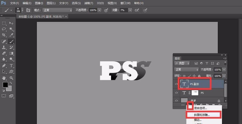 最后,我们选中复制的文字图层,点击图层面板下方的fx选项,给图层添加一点斜面和浮雕效果,如下图所示,photoshop制作立体文字操作完成。