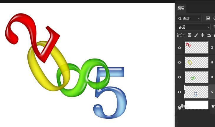 使用横排文字蒙版工具输入四个数字,每个数字单独一个图层,并填充颜色,或者你也可以使用横排文字工具,但是要将文本图层栅格化,如图所示。