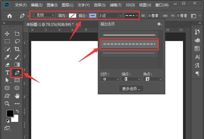 我们点击【钢笔工具】选择【形状】,把填充设置为无,然后设置好描边颜色,大小为3点,描边类型选择为虚线,如图所示。