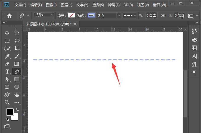 我们用钢笔工具在画布上面,画出一条直线的形状,这时候直线就会自动变成虚线的效果了,如图所示。