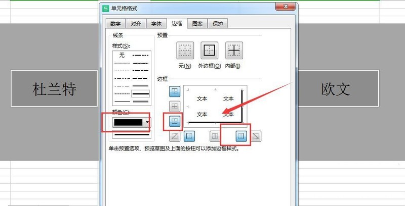 再将颜色设置为黑色,点击“下边框”和“右边框”;