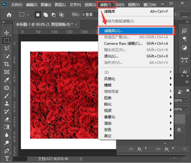接下来,我们选中蒙版,然后在上方点击【滤镜】找到【滤镜库】,如图所示。
