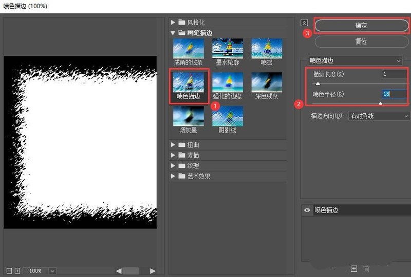 我们在【画笔描边】中选择【喷色描边】,然后调整描边长度和喷色半径的参数,点击【确定】,如图所示。