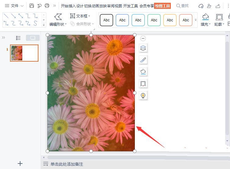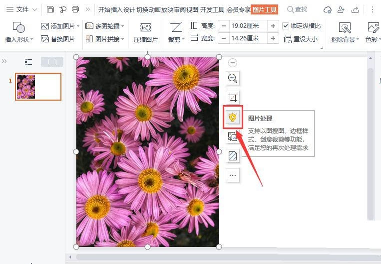 我们在PPT中插入一张自己喜欢的图片(比如:花朵图片)接着,我们选中图片,然后点击图片边上的第3个小图标【图片处理】,如图所示。