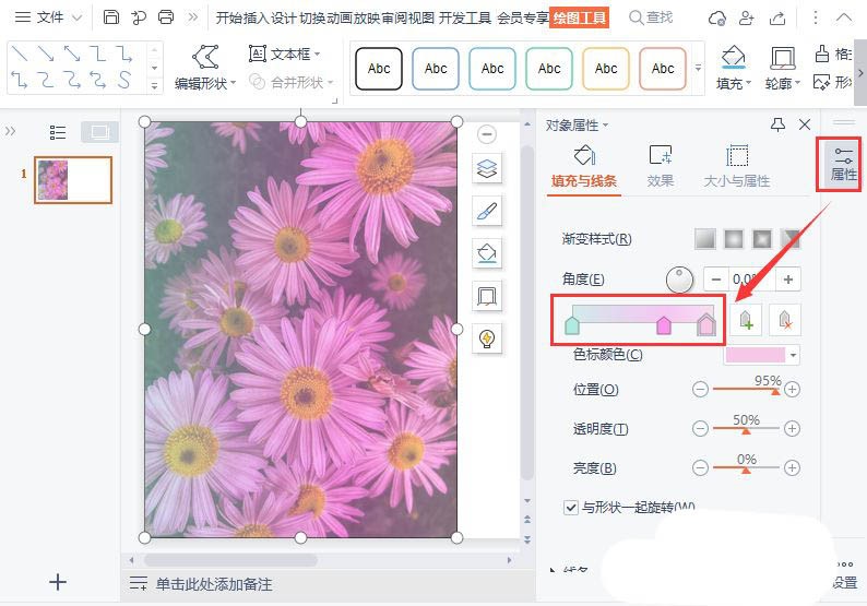 如果不喜欢默认样式中的颜色,我们在右边点击【属性】,然后分别调整渐变的颜色即可,如图所示。
